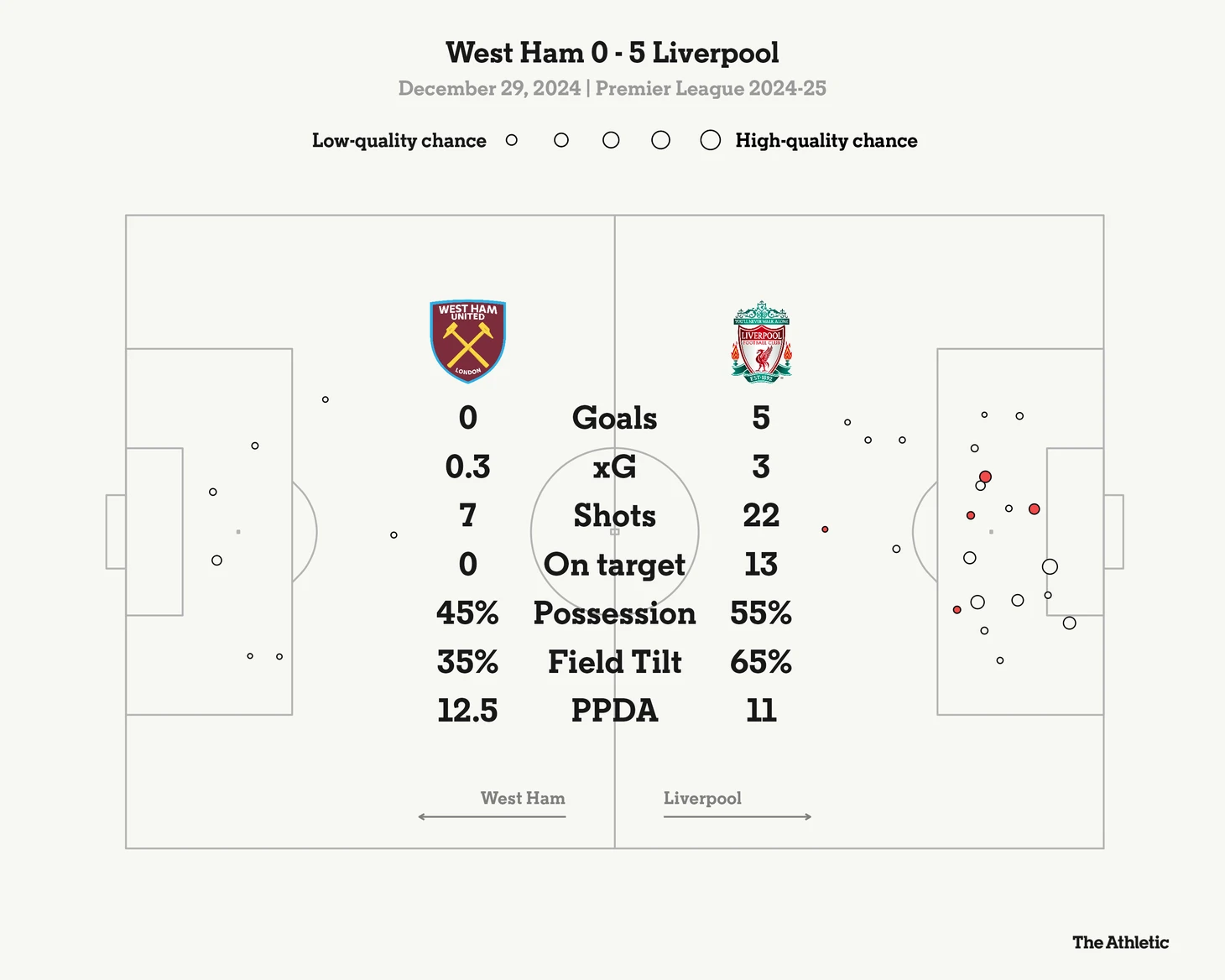 Однако такие крупные победы не были характерны для «Ливерпуля» на протяжении этого сезона. Десять из 14 побед в лиге были одержаны с перевесом в один или два мяча. Восьмой сухой матч против «Вест Хэма», самый результативный в лиге, и 15-й раз за 28 матчей во всех соревнованиях, когда команда ограничивает шансы соперника менее чем одним ожидаемым голом (xG).