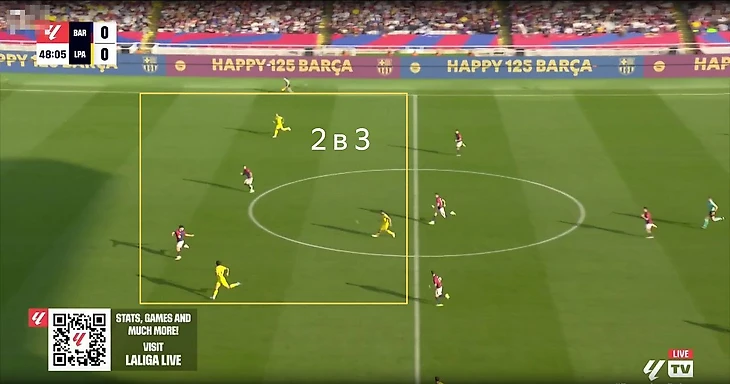 А иногда противники каталонцев откровенно пытаются манипулировать стилем команды Флика.. Например, здесь «Лас-Пальмас» коротко разыгрывает от ворот и вытягивает игроков «Барсы» в прессинг. А затем преодолевает давление и выходит в атаку на свободном пространстве с численным преимуществом.