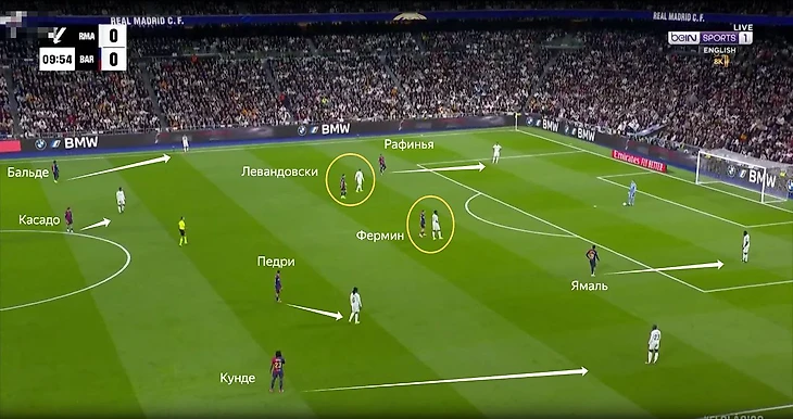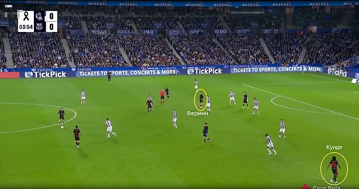 Недоступность Ямаля подтолкнула Флика к экспериментам. Далеко не всегда удачным. Например, против «Реал Сосьедада» справа появился Фермин Лопес. Фактически он не закрывал ширину на постоянной основе и смещался ближе к центру, а край закрывал Кунде. Но динамика на правом фланге все равно потерялась и команда лишилась источника угрозы на этом краю.