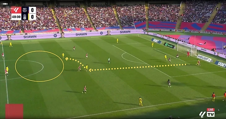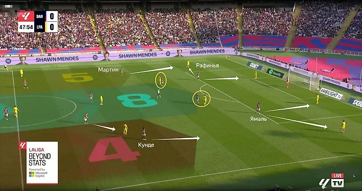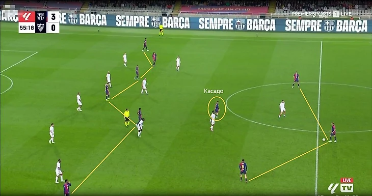 Очень часто в более глубокой позиции остается один Касадо, а Педри (или другой игрок, который изначально выходит на позиции партнера Касадо по опорной зоне) может подниматься к чужой штрафной и действовать в более атакующей роли.