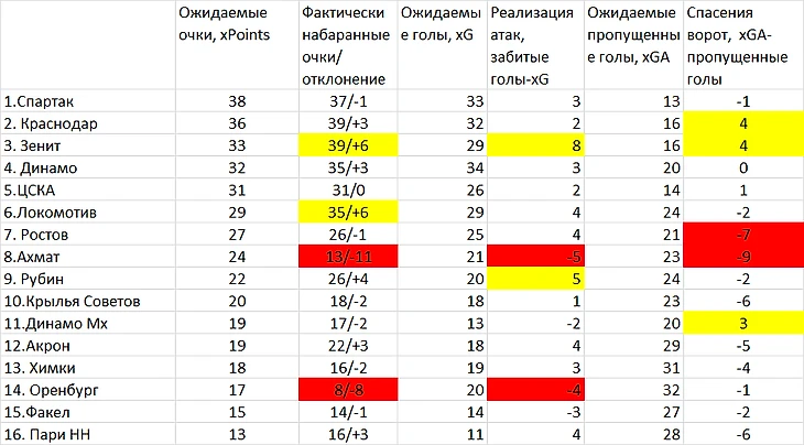 из которой видно, что все 10 лучших команд РПЛ забили больше, чем создали моментов, что принципиально отличается от АПЛ, где 10 первых забили меньше, чем создали. Еще одно кардинальное отличие - в Англии «оверперформят» в основном андедоги вроде Ноттингема, а в России - абсолютный фаворит Зенит и один из лидеров - Локомотив. Но при всех отличиях итоговое положение команд в первую очередь зависит от надежности обороны с учетом «кражи голов» от вратарей: крылатая фраза о взятии титулов подтверждается и российским чемпионатом. Отмечу еще забавное совпадение двух таблиц для двух команд, за которые я болею: ЦСКА и Челси имеют нулевое расхождение по ожидаемым и набранным очкам, - это наверное «награда» мне за то, чем занимаюсь в обзорах. Хотя я бы предпочел «оверперформинг».