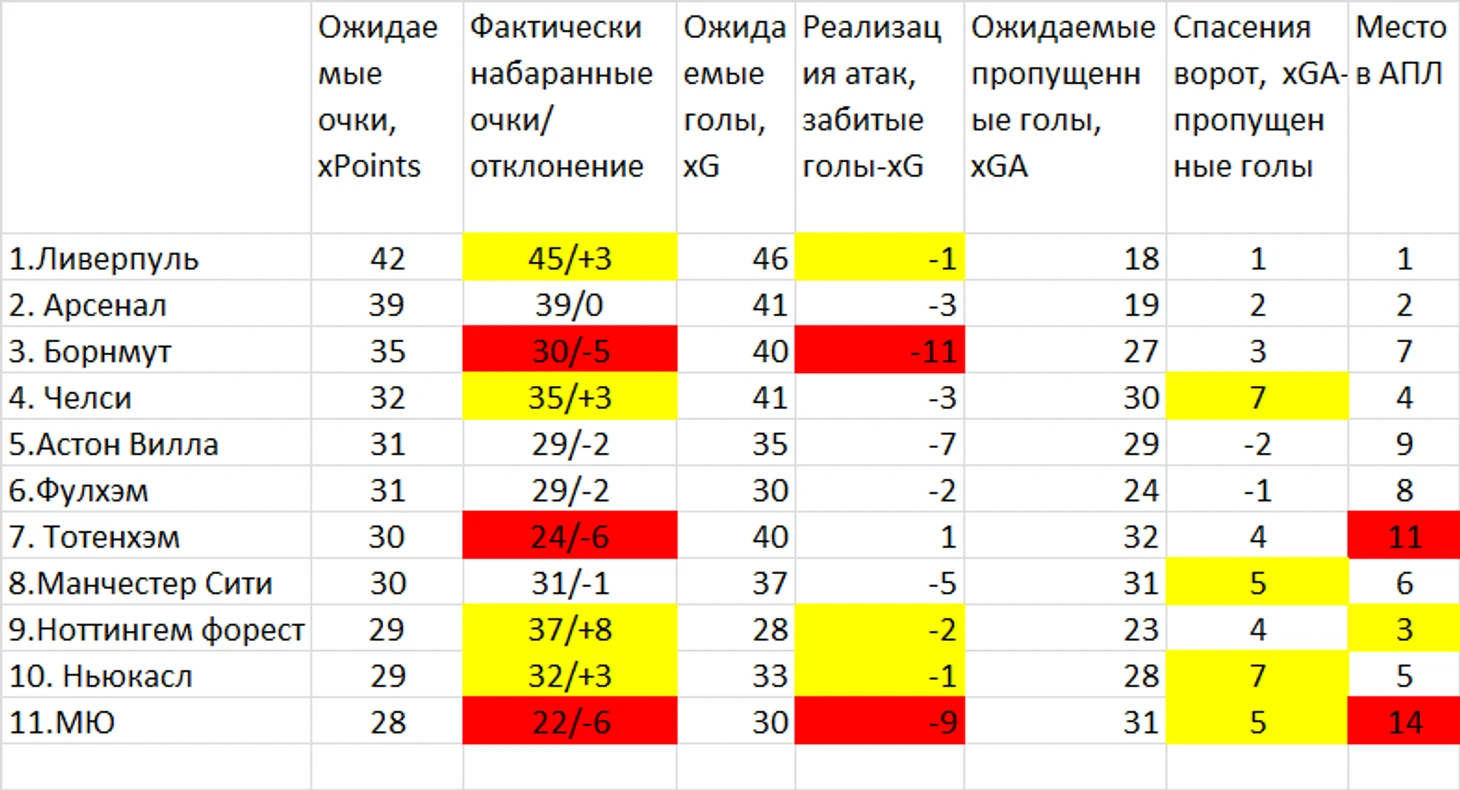 Сначала - таблица АПЛ по метрикам xG на 01.01.2025