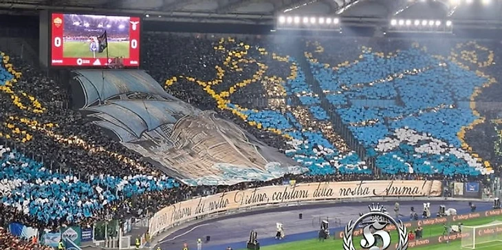 Сами же «лациале» ответили перфомансом на морскую тематику «С 1900 года хозяева своей судьбы, капитаны наших душ!». «Лацио», как было нетрудно догадаться, основан как раз в 1900 году — произошло это на северном берегу реки Тибр, когда 9 спортсменов (официально создателями сообщества называются именно 9 человек, хотя фактически на той встрече их было 15, в том числе и Олиндо Битетти, который даст клубу его нынешнее имя) во главе Луиджи Биджарелли основали спортивное сообщество. Внимательный читатель в комментариях указал, что во главе корабля на перфомансе изображён именно он. Там же, на корабле, есть фигура и другой культовой фигуры в истории «Лацио» — Джорджо Ваккаро, который в 1922 году вошёл в состав правления клуба. Спустя 5 лет он спас команду от исчезновения: секретарь фашисткой партии Итало Фоски предложил объединять все команды региона в один мощный и конкурентоспособный коллектив. Не стала исключением и столица, где все местные клубы должны были влиться в «Рому» с сохранением красно-жёлтых цветов в честь цветов городского управления. Перечить правительству было чревато, но и перспектива слияния с извечными врагами никого в «Лацио» не устраивала. Тогда один из основателей клуба Битетти (тот самый, что дал имя команде) назначил генерала Ваккаро вице-президентом клуба, чтобы тот мог полноправно говорить от лица «Лацио» на предстоящей встречей с Фоски. На ней Ваккаро заявил, что объединение возможно под именем «Лацио», хотя в целом в бело-голубой команде против слияния, так как «Рома» и «Лацио» являются соперниками на футбольном поле, а здоровая конкуренция позволяет прогрессировать и тем, и других. Плюс у «Лацио» было больше болельщиков, поэтому Фоски быстро капитулировал и не стал настаивать на объединении. Так «Лацио» продолжил своё существование, а тифози бело-голубых своей фразой про «хозяев своей судьбы» в перфомансе на дерби лишний раз подчеркнули то, что «Лацио» сам выбирает свою дорогу вне зависимости от правящих партий и указаний сверху.