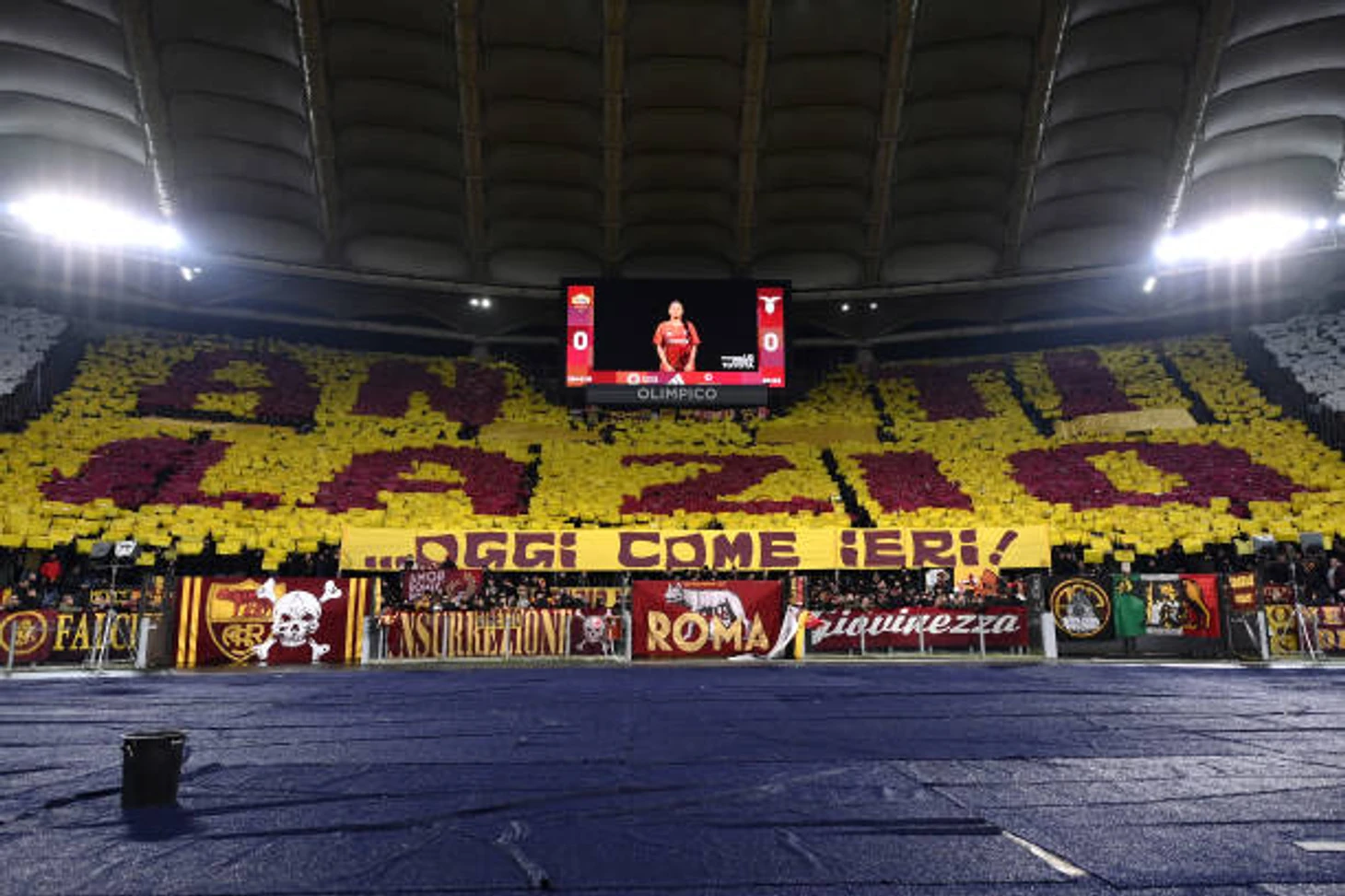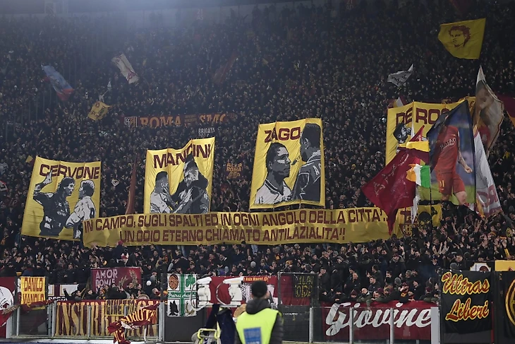 Другой акцией стал баннер с текстом «На поле, на трибунах и в каждом уголке города вечная ненависть, называемая антиЛацио!», который сопровождался драками с участием футболистов «Ромы» в дерби прошлых лет: в 1994 году вратарь Джованни Червоне сцепился с форвардом Аленом Бокшичем, в 2023 году капитан «Лацио» Алессио Романьоли (перешел в стан «орлов» даже несмотря на то, что является воспитанником «Ромы») слишком бурно праздновал победу в дерби, за что получил в лицо от все того же Джанлуки Манчини, бразилец Антонио Заго плюнул в дерзкого Диего Симеоне в дерби-1999, ну а Даниэле Де Росси, который еще недавно был главным тренером клуба, ударил по лицу игрока «Лацио» Штефана Раду во время победного матча в рамках 1/8 финала Кубка Италии в 2011 году. Последний баннер чем-то напомнил перфоманс от ультрас «Юргордена» в дерби против «АИКа» — тогда их фэны тоже изобразили в своем перфе памятные моменты с прошлых дерби, в которых футболисты «Юргордена» причиняли физическую боль игрокам «АИКа» во время единоборств, подкатов и откровенно грубой игры.