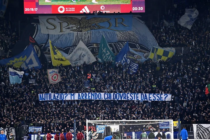 Было забавно, что ультрас «Лацио» заранее знали о том, какой будет перфоманс у их врагов, потому что еще до появления перфоманса на трибуне «Ромы» они развернули язвительный баннер «АнтиЛацио? Я сдаюсь. Кого вы должны забрать?».