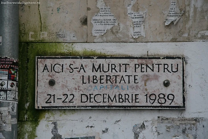 Он был стилизован под памятную табличку, установленной в центре румынской столицы. Погибшими в ходе революции признаны 1104 человека, а раненными – 1413.