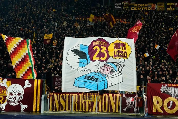 Тифози «Ромы», в отличие от своих «коллег» из «Лацио», не знали о том, что будет на противоположной трибуне, но их подкол в адрес оппонентов был не менее забавным: они изобразили фаната «Лацио», который перед сном только и думает о «Роме», а именно о баннере с крысой на бело-голубом фоне, защитнике «волков» Джанлуке Манчини, и перфомансе про «АнтиЛацио», который не будет давать покоя бело-голубой части Рима в последующие месяцы. Баннер с крысой и упоминание Манчини здесь тоже не просто так — в дерби прошлого сезона единственный гол был как раз на счету Манчини, который после матча отпраздновал победу перед своей фанатской трибуной, размахивая флагом «АнтиЛацио». А несколькими минутами спустя «Рома» в полном составе сфотографировалась у своей трибуны с этим же баннером, а также с флагом с крысой на заднем плане (подробнее о перипетиях того дерби читайте ТУТ). Тогда те кадры наделали много шума, Манчини оштрафовали на 5.000 евро, а у тифози «Лацио» на фоне всего этого нехило горели пятые точки. Именно по этой причине «романисты» решили еще раз «прогреть» своих заклятых врагов.