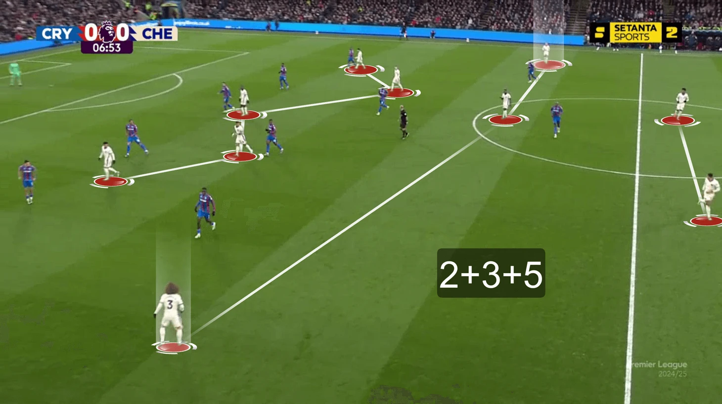 Смело, но шалость удалась. Мареска попался на удочку и захотел удивить коллегу. Впервые в сезоне использовал структуру 2+3+5. Важное отличие от предыдущих версий «Челси» – крайние защитники не в ложных, а в классических широких ролях. Показательно, что ширину держали Гюсто и Кукурелья – игроки, способные смещаться в центр: