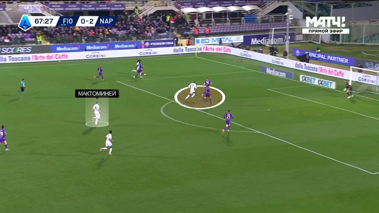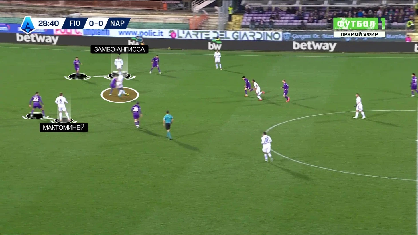 Особенно грандиозен в таких взаимодействиях Мактоминей – он делает так много рывков в атаку, что его роль вполне можно описывать как скрытый нападающий. Под «Наполи» тренер «Фиорентины» Раффаэле Палладино вернулся к тройке центральных защитников, но даже это не помогло сдержать описанные механизмы – 0:3.