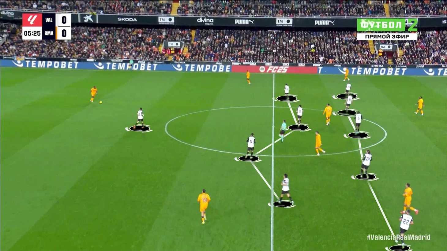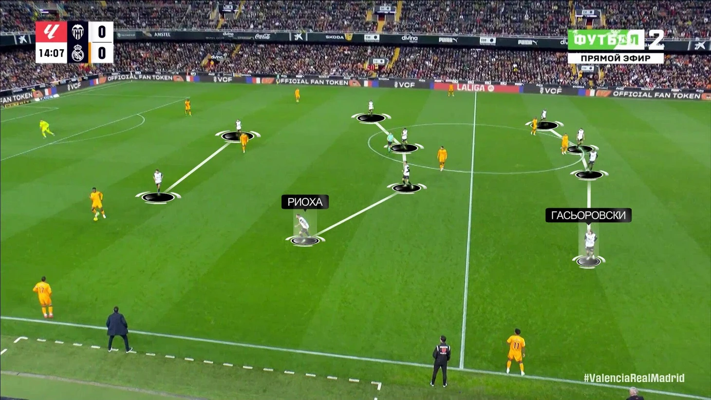 При обороне выстраивались в 5-4-1 с Риохой в качестве латераля. Важный нюанс: в этой стадии «Валенсия» не садилась в автобус, а завышала линию при каждой возможности. Почти в стиле «Барсы»: