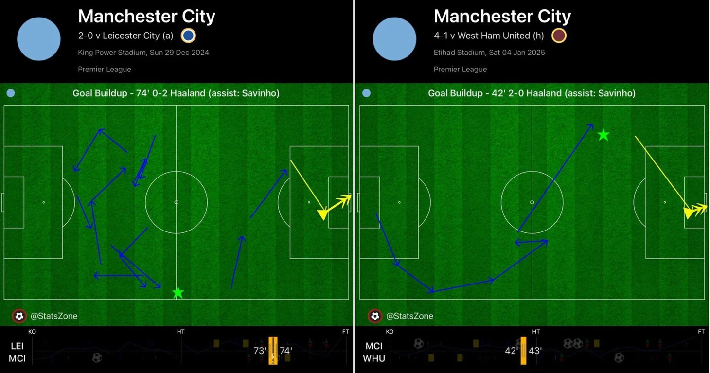 ● По мнению Пепа, с левого фланга Савиньо проще искать передачами Холанда. Конкретно – вырезать кроссы с рабочей ноги. Эрлинг уже дважды забивал после них. С правого фланга таких не было – соперники успевали перестроиться, пока бразилец перекладывал мяч с правой под левую;