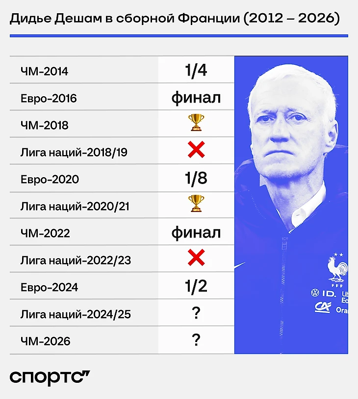 Тогда же французские медиа писали, что Дидье Дешам уйдет вне зависимости от результатов, но он в итоге продлился до 2026-го.