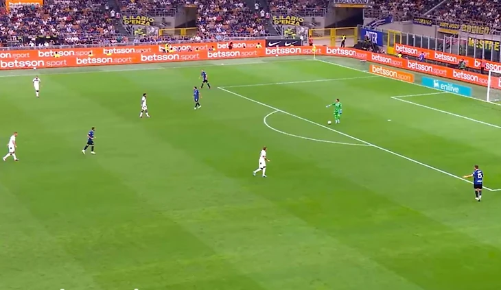 Так в чем заключается главная идея «Интера» в этом эпизоде? Логика всех этих смещений простая – игроки нацелены на поиск свободного здесь и сейчас пространства, а не на удержание конкретных структурных зон. Будь команда Индзаги ориентирована на ротацию с сохранением схемы, в этом эпизоде Ачерби не оказался бы на фланге, Франческо был бы прикован к позиции, либо же был бы вынужден вписать себя в рамки структуры билд-апа «3+2», двигаясь в более узкую позицию. Но Индзаги не ставит перед своей командой такую задачу. Для него главное на поле – пространство, а структура – это вымысел для тех, кто не может обеспечить своим игрокам безопасный хаос, как бы парадоксально это ни звучало.