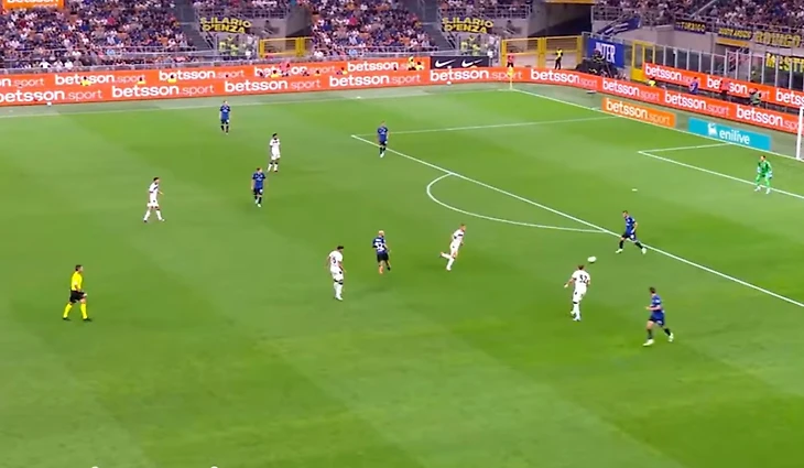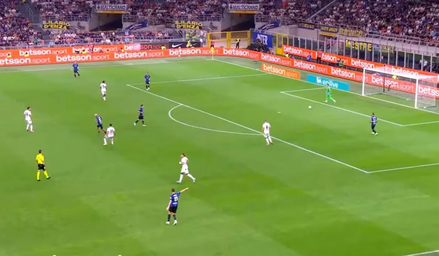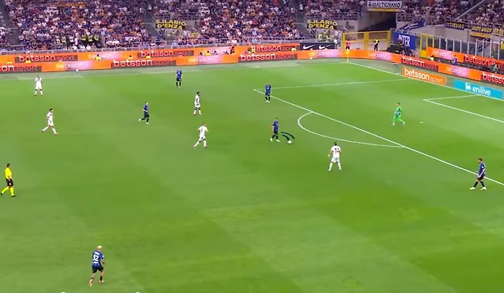 Мхитарян, видя свободное пространство, опускается ниже, чтобы у Зоммера был свободный адресат для передачи, по итогу получая мяч. Здесь вы можете увидеть, как Федерико Димарко уже среагировал на это движение Генриха и нашёл образовавшееся в результате этого смещения свободное просратснвто. Прямо сейчас он делает рывок в этом направлении.