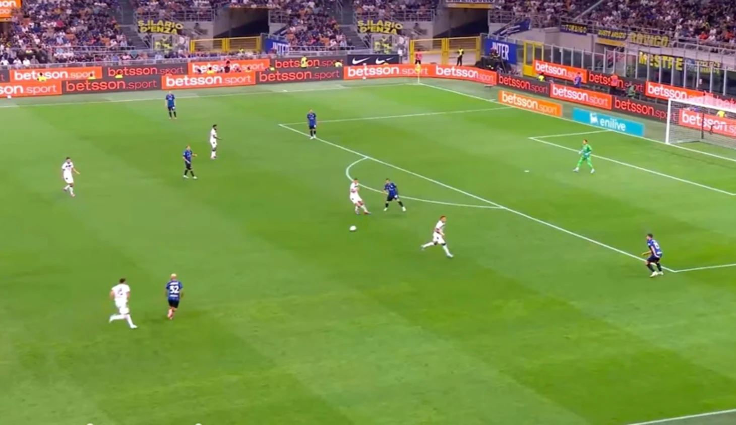 После передачи Генриха, игрок «Аталанты» начинает следовать за Феде, обозначая прессинг. В этот момент Ачерби находит пустое пространство на фланге и начинает движение по вертикали. «Интер» преодолевает прессинг соперника уже на этом этапе, потенциально, но эпизод оказался немного длиннее.