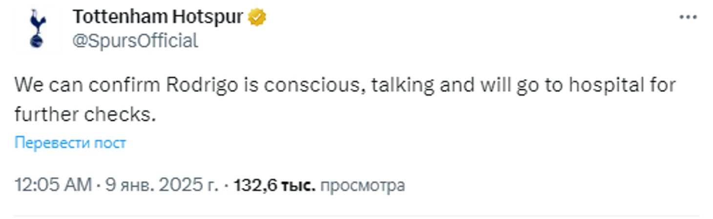 Официальный аккаунт «Тоттенхэма» дал обнадеживающую информацию: «Мы можем подтвердить, что Родриго находится в сознании, разговаривает и отправится в больницу для дальнейшего обследования».