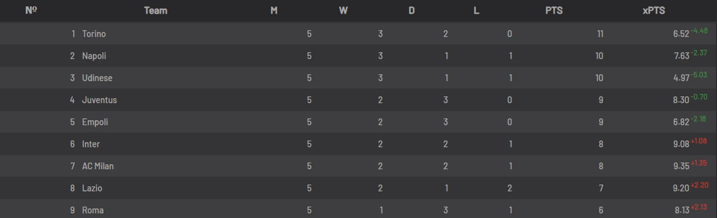 Для вящего понимания, к сентябрьской игре с «Лацио» туринцы подходили с космическим (особенно по меркам дистанции) очковым оверперформом: аж + 4,48 xPTS. Мощнее заигрывали с фортуной лишь фриульцы, имевшие + 5,03.