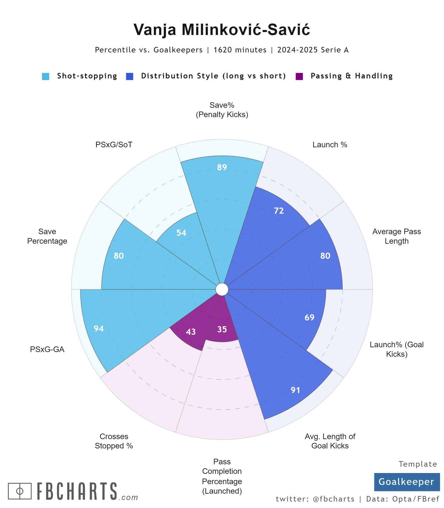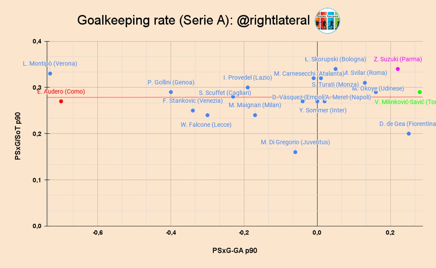 Наконец, Милинкович-Савич очень хорош в исполнении своих прямых обязанностей. Если оценивать вратаря через призму пост-шотов (PSxG-GA), Ваня – лучший в лиге. Судзуки, например, достаются наиболее тяжелые по весу удары (PSxG/SoT), однако он со своей нагрузкой справляется чуть хуже. Серб же обгоняет даже Де Хеа.