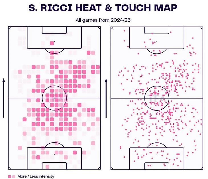 Риччи вездесущ. Его сложно назвать каноничным бокс-ту-боксом – по крайней мере, в Италии его заставит подвинуться как минимум Мактоминей. Но Саму, являющий собой причудливый сплав из «шестерки», «восьмерки» и «десятки», почти всегда появляется в нужном месте.