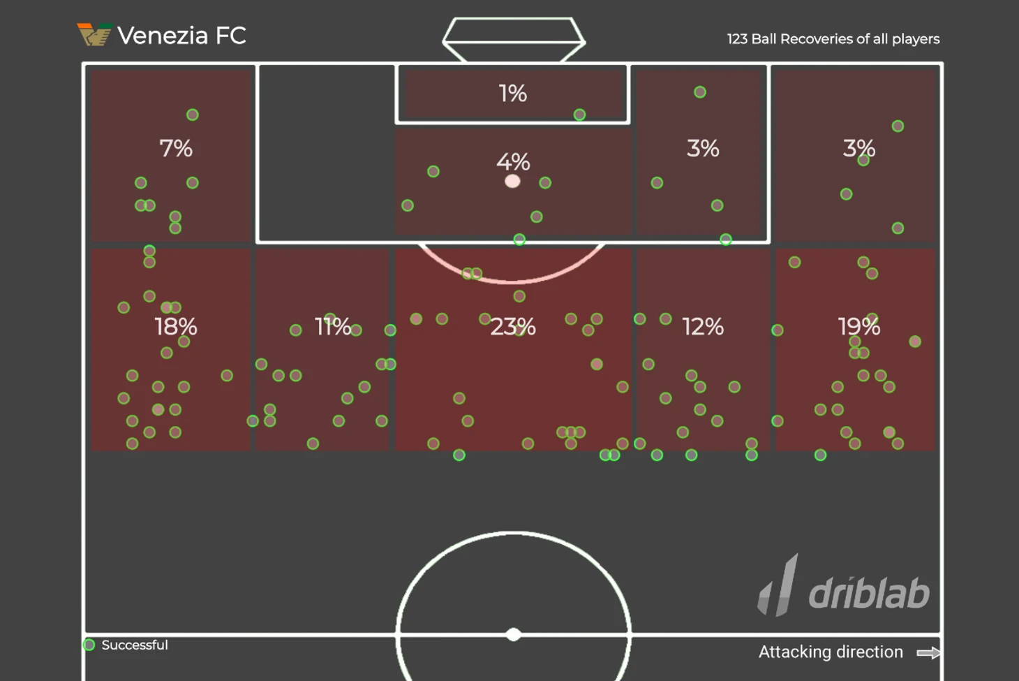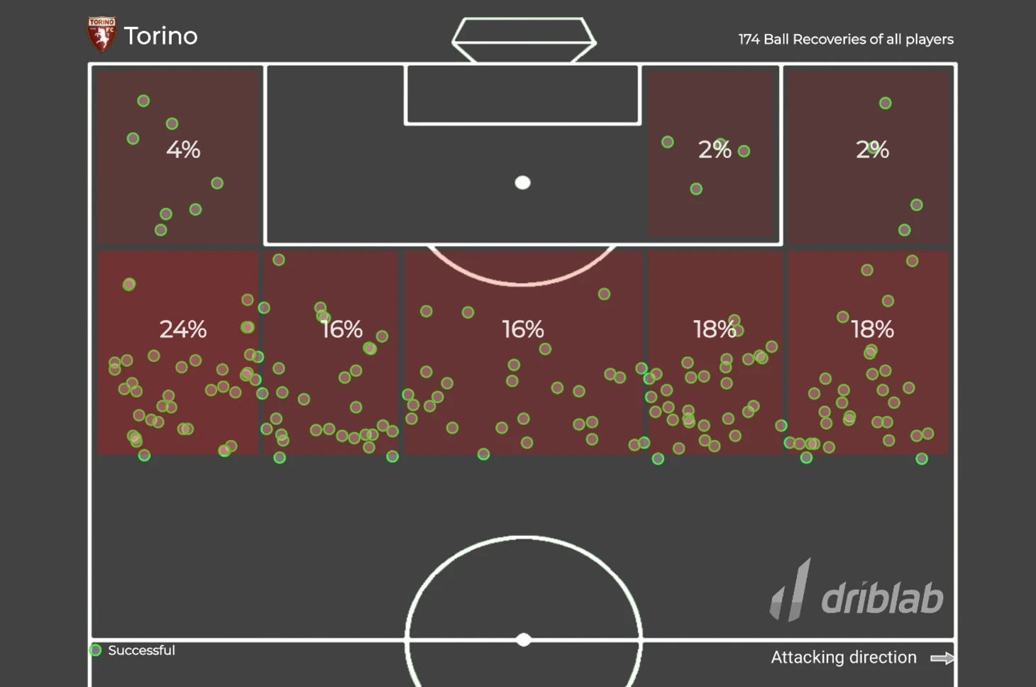 Парадоксально, но это правда. Стиль предыдущей команды Паоло имел определенную схожесть со стилем прошлогоднего «Торино», главным же образом по части высоких возвратов. Но есть, как говорится, нюанс: «Венеция» играла в Серии Б, сталкиваясь с куда меньшим сопротивлением во всех игровых фазах. В частности, доля экстремально высоких возвратов (у лицевой линии) венецианцев была значительно выше, нежели у «быков».