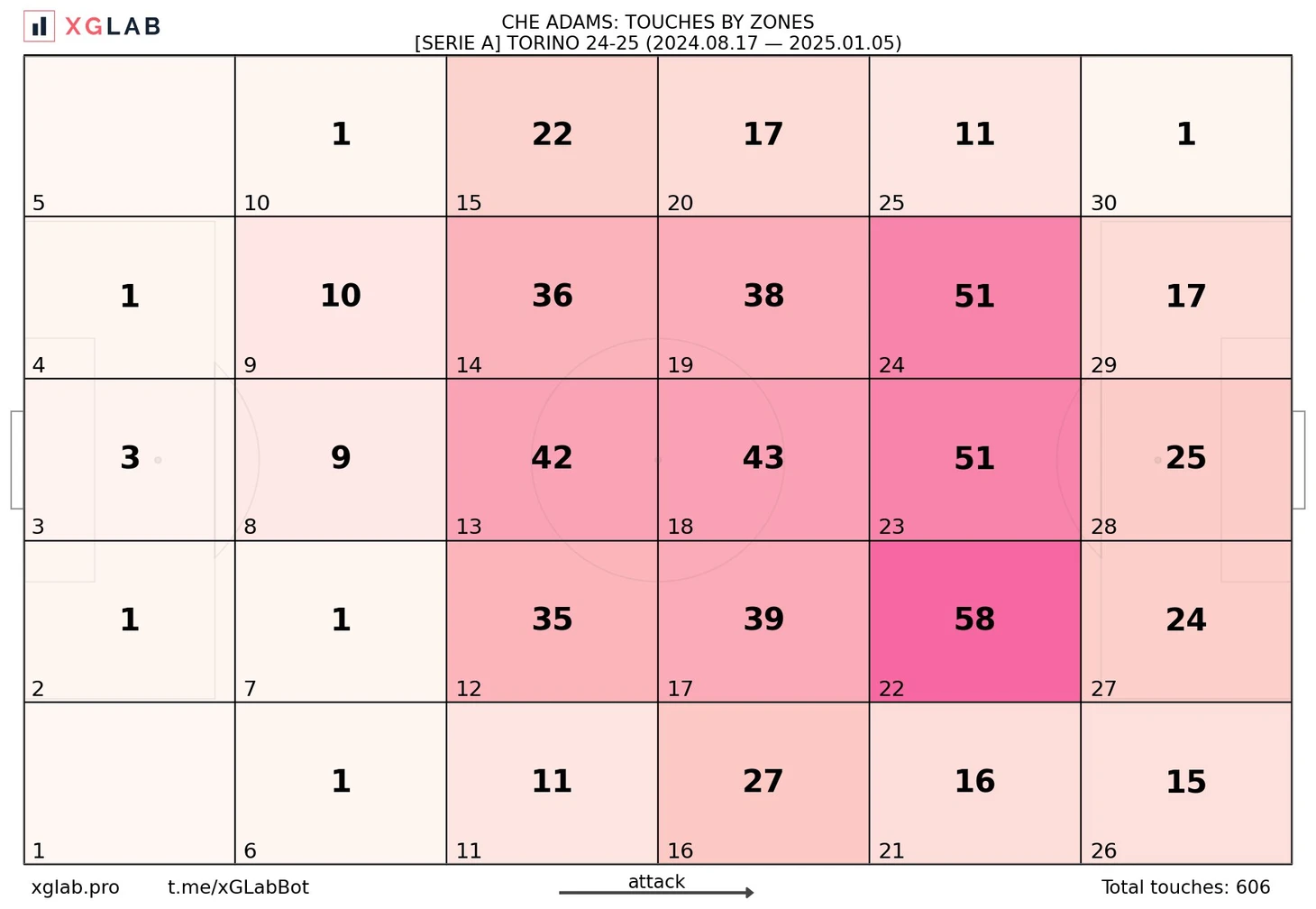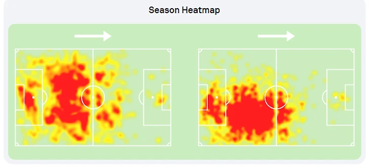 На африканца легла самая большая нагрузка в команде после Риччи. Он чаще других поднимался в более высокую позицию, чаще увлекал за собой прессингующих соперников на фланг. Взгляните, как изменилась его тепловая всего за полгода (слева – текущий сезон, справа – 2023/24):