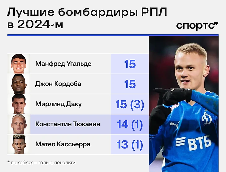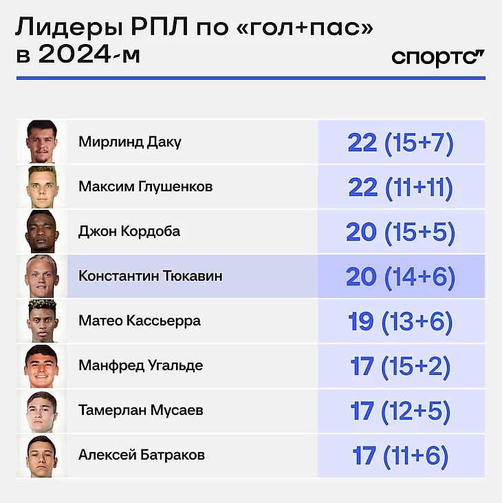 В 2024-м Тюкавин – лидер «Динамо» по «гол+пас» (14+6) и в топ-4 самых результативных игроков РПЛ. Столько же у Джона Кордобы (15+5), впереди – Мирлинд Даку (15+7) и Максим Глушенков (11+11).