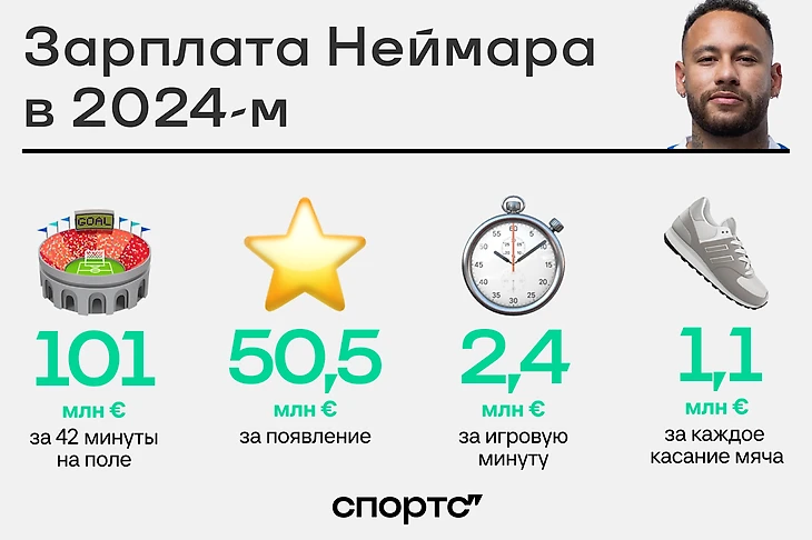 Неймар в Саудовской Аравии редко играет, зато с бешеной скоростью богатеет. За прошлый год наскреб 42 игровых минуты – и заработал 101 млн евро!
