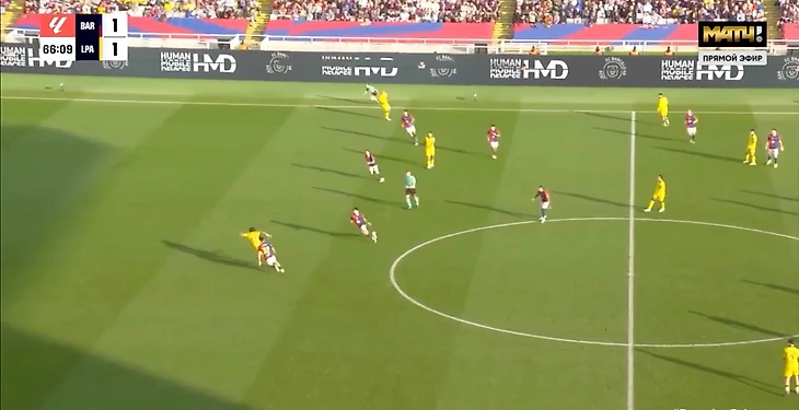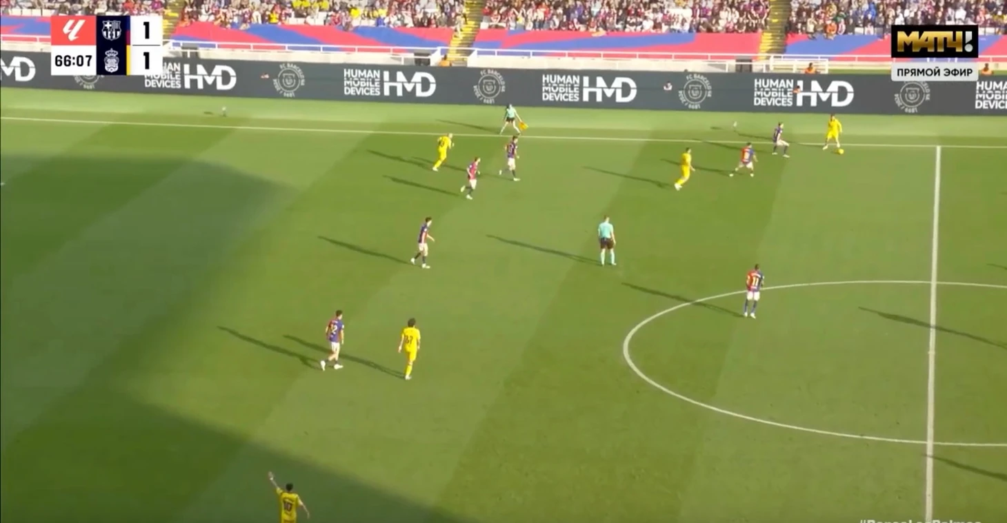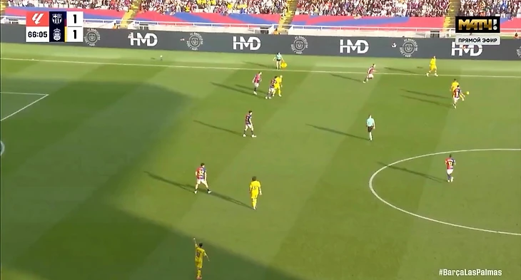 2. Игроки «Лас-Пальмаса» начинают мелкую игру в пас на небольшом пространстве, заставляя «Барсу» стягиваться ближе к флангу, чтобы сохранять плотность и инициировать прессинг.