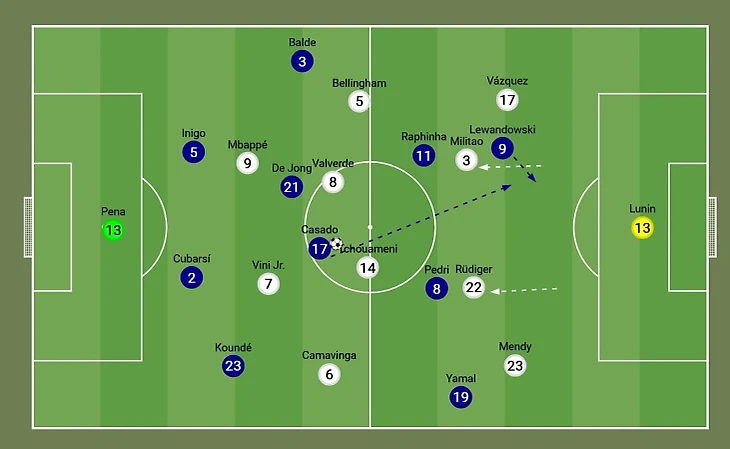 Прессинг стоит использовать, но он не главное оружие «Реала», поэтому важно отсутствие фанатизма – необходимо качественное давление в среднем блоке, но без вовлечения в это дело центральных защитников, которые не должны оставлять пространство за спиной для забегов Рафиньи, Левандовского или Ямаля. В октябре «Мадрид» сыграл так только тайм (и не позволил сопернику создать явных голевых моментов), но во втором Анчелотти решил до упора вжать педаль газа в пол, подняв Вальверде и Тчуамени еще выше в прессинге и заставив Рюдигера и Милитао реагировать на движение полузащитников «Барсы».