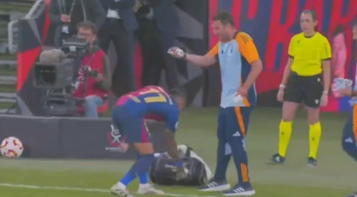 Медицинская бригада «сливочных» выбежала на поле, чтобы помочь звездному форварду, но делала это довольно долго. В какой-то момент нервы сдали у капитана «Барселоны» Рафиньи Диаса. Он не нашел лучшего способа, чтобы ускорить процесс, кроме как унести за пределы поля одну из сумок медбригады «Мадрида».