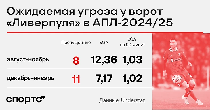 «Ливерпуль» действительно пропускает больше, но о каком-то серьезном кризисе говорить рано. Ситуация больше похожа на регрессию к среднему: до декабря пропускали меньше, чем должны были, сейчас – больше.