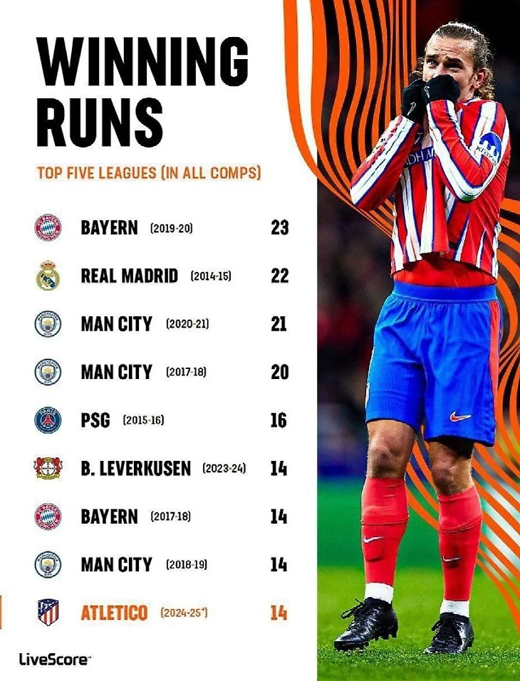 «Атлетико» вошел в элитный список клубов топ-5 лиг Европы с самыми длинными победными сериями во всех турнирах. Дольше всего среди европейских грандов не проигрывала «Бавария». В сезоне-2019/20 команда под руководством Ханси Флика побеждала в 23-х матчах подряд во всех турнирах!