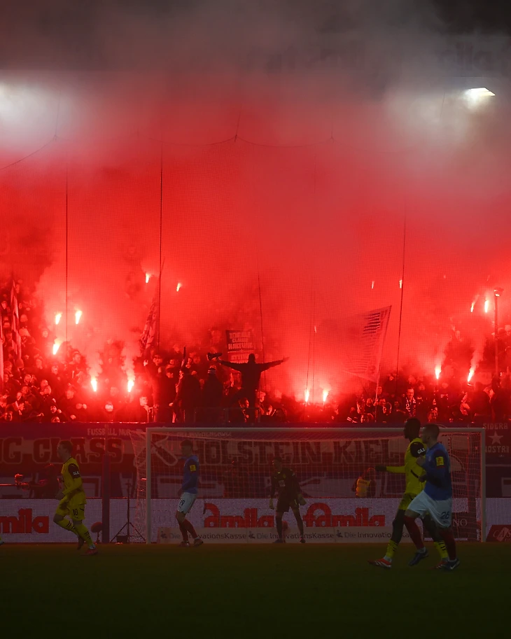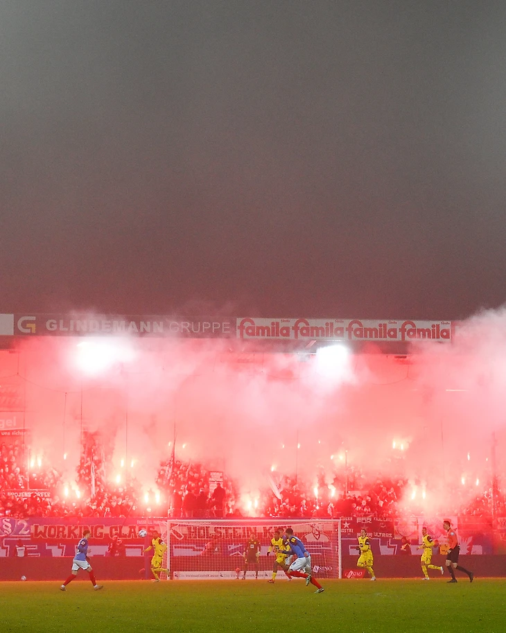 Поклонников скромного «Хольштайна» так впечатлила игра любимой команды, что они принялись без остановки жечь фаеры. Выглядело, конечно, эффектно.