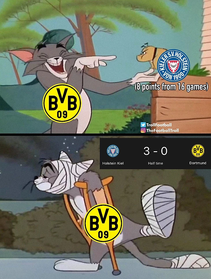В Киле прошел безумный матч Бундеслиги. В гости к местному «Хольштайну» приехала дортмундская «Боруссия» и за тайм пропустила три гола от соперника, занимающего предпоследнюю строчку в турнирной таблице немецкого первенства.