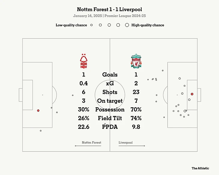 Ничья 1:1 сохраняет шестиочковый отрыв «Ливерпуля» от «Форест», даже если главный тренер Арне Слот будет испытывать сомнения, как и после первого матча на «Энфилде» четыре месяца назад, когда его команда проиграла со счетом 0:1, несмотря на отличный второй тайм.