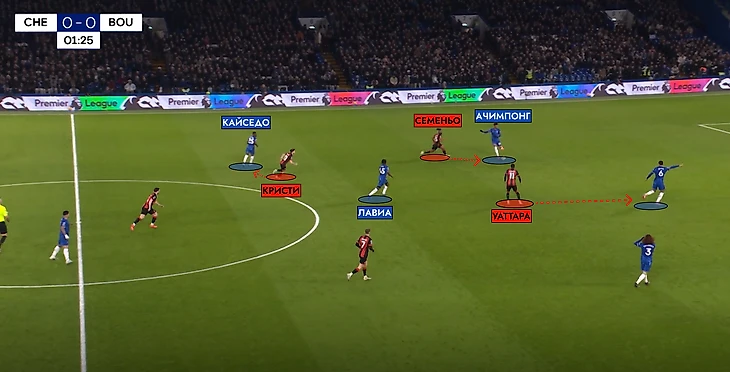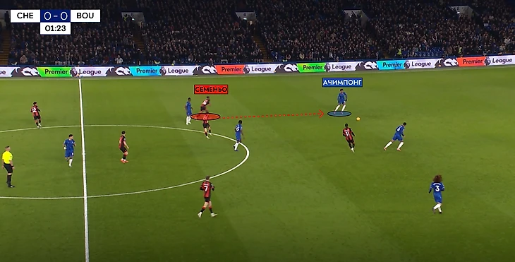 Во многом, успешное выступление команды Энцо Марески в первой половине матча было связано с тактическим превосходством в центре поля. «Борнмут» оборонялся в среднем блоке в схеме «4-1-4-1». Причем, «вишни» шли в «точечный» прессинг, оказывая давление только на игрока с мячом, или будущего адресата. Пример: Вторая минута матча – Уиттара прессингует Колвилла, и тот отдает передачу Ачимпонгу, на которого уже выдвигается Семеньо.