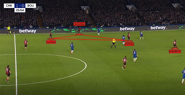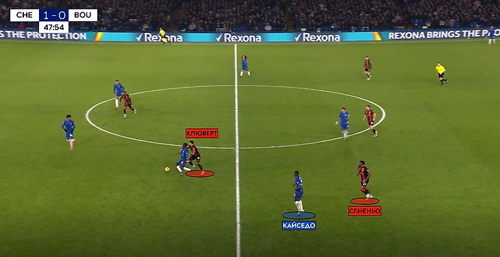 «Борнмут» давил на правый край обороны хозяев перегрузом – фуллбек Керкез поднимался выше в левый полуфланг, а его место для подстраховки занял Адамс. Не забываем про Семеньо в широкой позиции, и получаем, что против Кайседо могли оказаться сразу двое игроков «Борнмута».