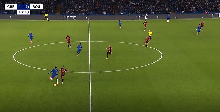 Второе, на что хочется обратить внимание – это то, как Нико Джексон смог мастерски продвинуть атаку, не потеряв мяч в окружении трех игроков «Борнмута».
