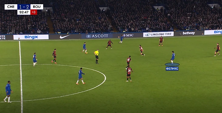 На 82-1 минуте Мареска меняет Нони Мадуэке и Мойзеса Кайседо на Педро Нету и Жоао Феликса. Номинально, одним опорником в центре поля оставался Энцо Фернандес, когда как «синие» перешли в формацию «4-1-4-1» в обороне.