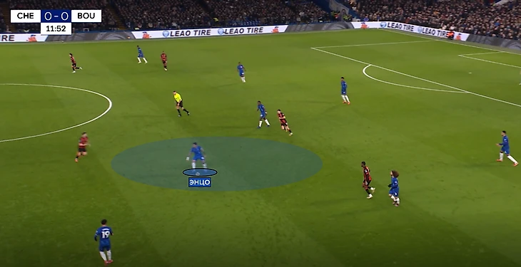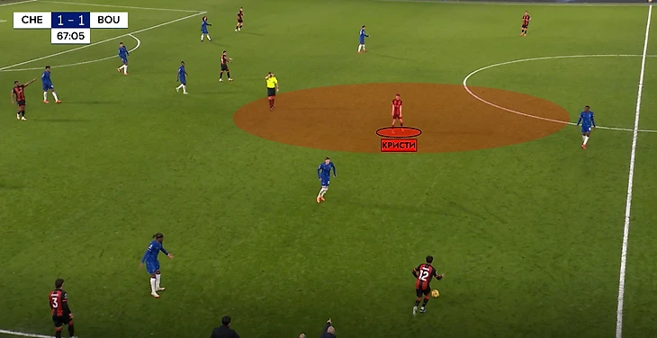 «Синие» открыли счет благодаря удачной игре в переходной фазе. Сперва похвалим Кукурелью за важный перехват передачи. Но интересное дальше – в атаке «Борнмут» не успевает перейти из обороны в атаку, и именно на стадии транзишена «Челси» ловит гостей, пользуясь зонами в полуфлангах. Обратите внимание, насколько много пространства у Энцо во время обреза «вишен».
