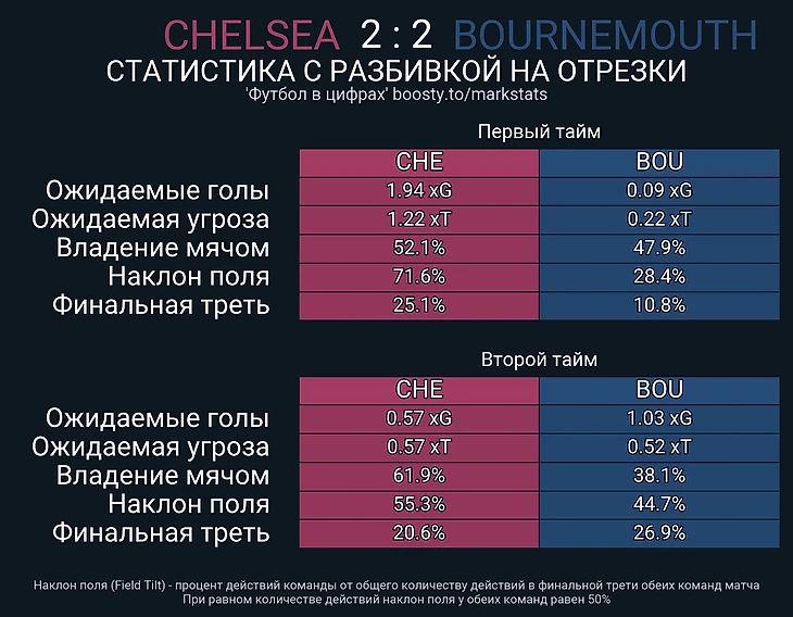 Посмотрите на таблицу выше. Сразу понятна главная причина неудачи «Челси» в этом матче – очередной провал во втором тайме. Предлагаю поделить эту статью на две составляющие – разбор тактики в первом тайме, и негативные перемены во втором. Думаю, такое повествование по таймлайну позволит раскрыть картину матча.