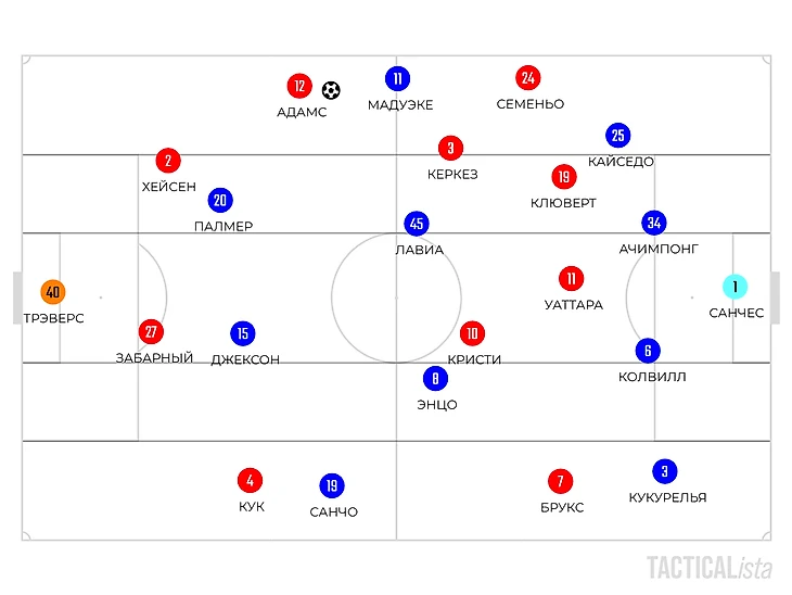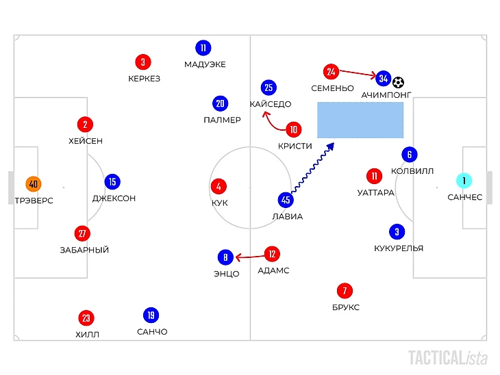 Но в организации прессинга ответственен не только вингер «вишен» – Кристи сразу выдвигался за Кайседо. Также, опорники гостей, Адамс и Кук играли по Энцо и Палмеру персонально.