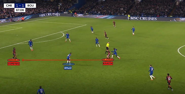 Далее, Энцо решил исполнить самого себя в игре в обороне – и никак не отреагировал на движение Кристи. Видимо, аргентинец ждал, пока хавбек гостей сам придет к нему. Передача на Семеньо спокойно проходит, и вингер первоклассно разбирается 1 в 1 с Ачимпонгом, поразив ближний угол ворот Санчеса.