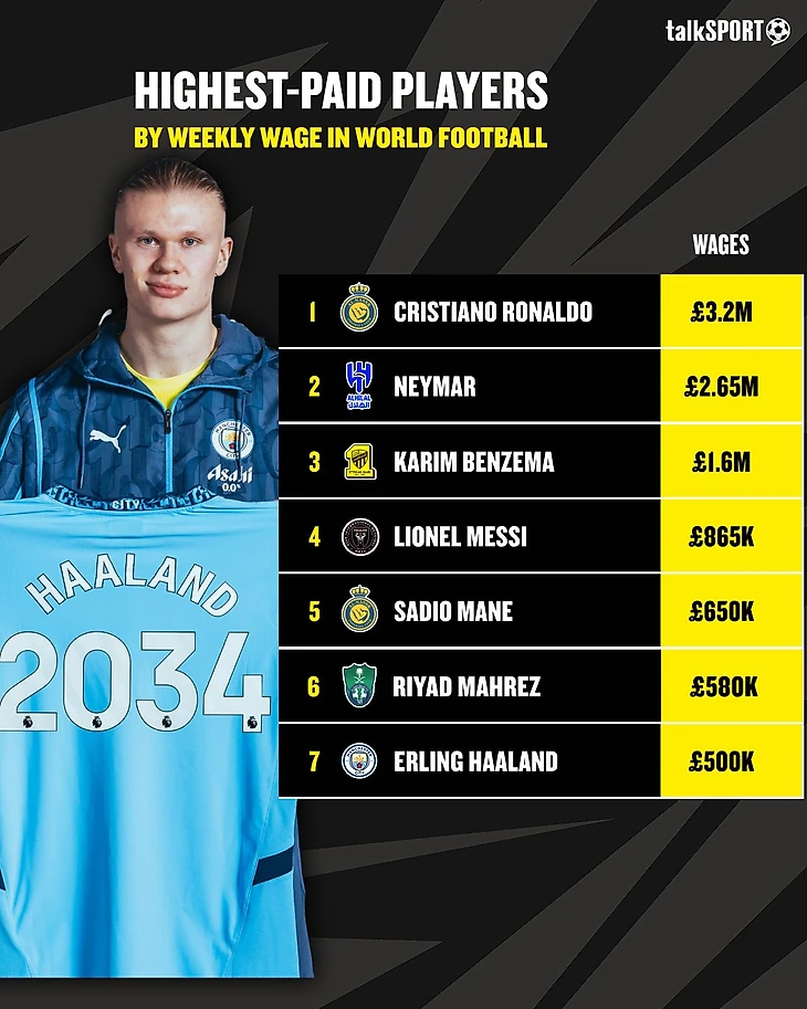 Выше норвежца оказались Рияд Марез («Аль Ахли») − 580 тысяч фунтов в неделю, Садьо Мане («Аль-Наср») − 650 тысяч, Лионель Месси («Интер Майами») − 865 тысяч, Карим Бензема («Аль-Иттихад») − 1,6 млн, Неймар («Аль-Хилаль») − 2,65 млн, Криштиану Роналду («Аль-Наср») − 3,2 млн.