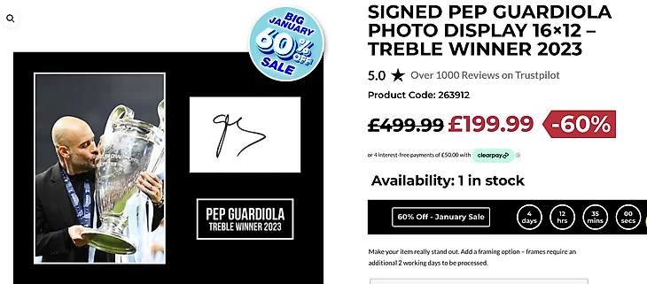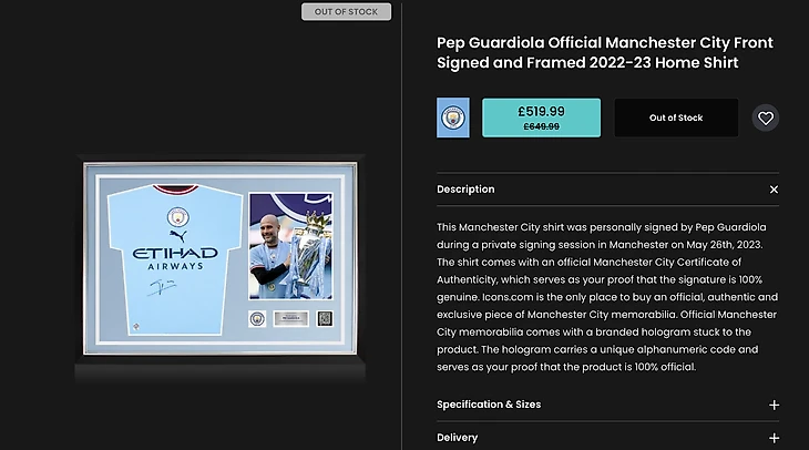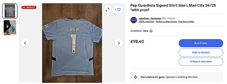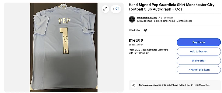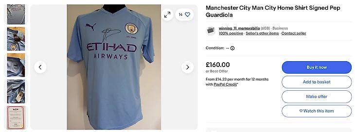 Когда все готово, подписанные вещи выкладывают на торговую площадку. В Англии популярен eBay. Подписанную фотографию можно выставить за 40-50 фунтов (5000 – 6000 рублей). Джерси «Ман Сити» с надписью «Пеп» и единицей на спине продают за 149,9 фунтов (где-то 18 700 рублей).