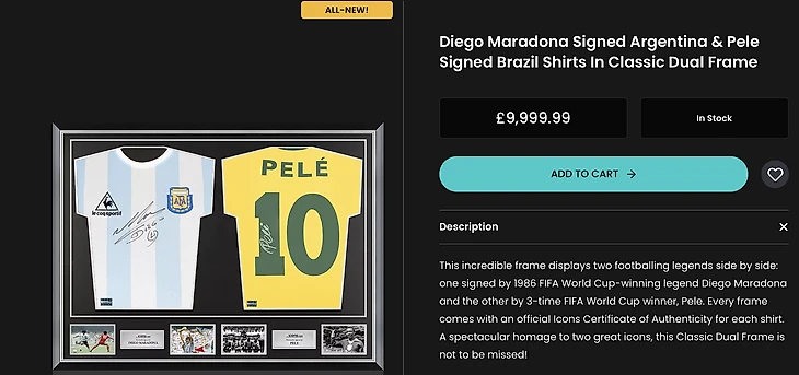 Доступны вещи с автографами легенд вроде Марадоны и Пеле. Ретро-футболку «Наполи» с автографом Диего можно купить за 4 тысячи фунтов (почти 500 000 рублей). Книга с автографом аргентинца стоит 1500 фунтов (186 000 рублей). Джерси Пеле доступны за сумму от тысячи до двух. Подписанная бразильцем фотография оценивается в 400 фунтов (почти 50 000 рублей). Есть и уникальный экземпляр – футболки Пеле (Бразилия) и Марадоны (Аргентина) в одной рамке. Цена – 10 тысяч фунтов (1 244 000 рублей).