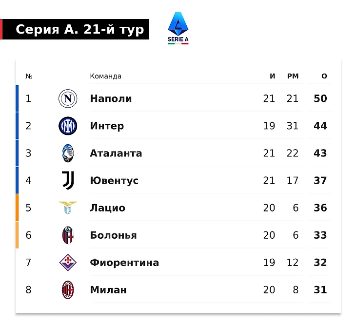 «Наполи» сохранил первое место и по очкам. У «Интера» минус шесть при двух матчах в запасе (могут сравняться). «Аталанта» в топ-3, но отпустила неаполитанцев еще дальше.