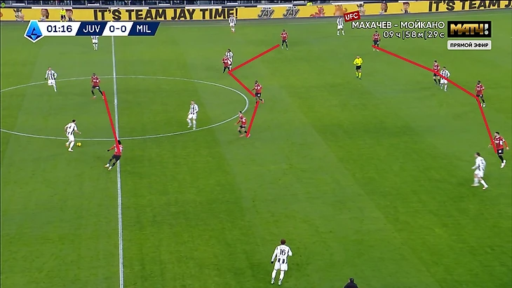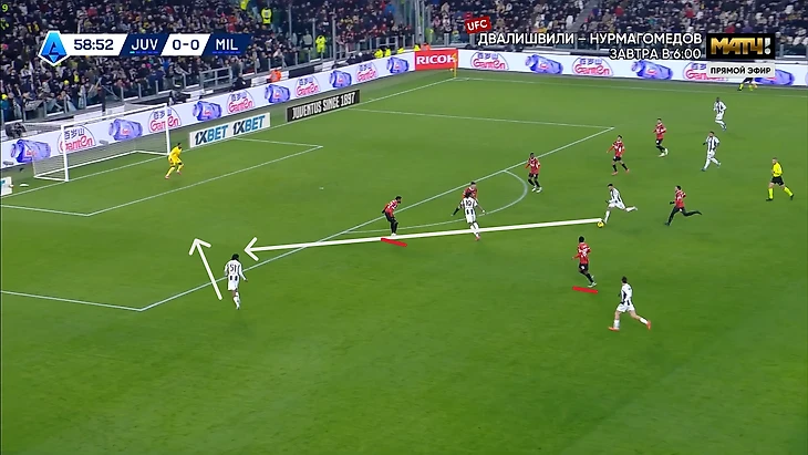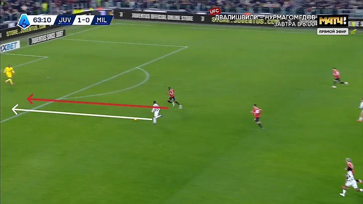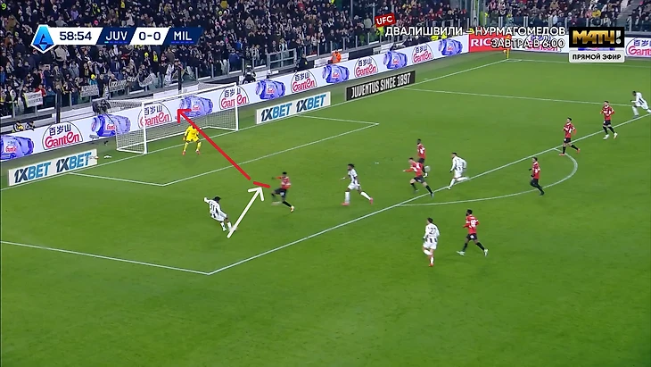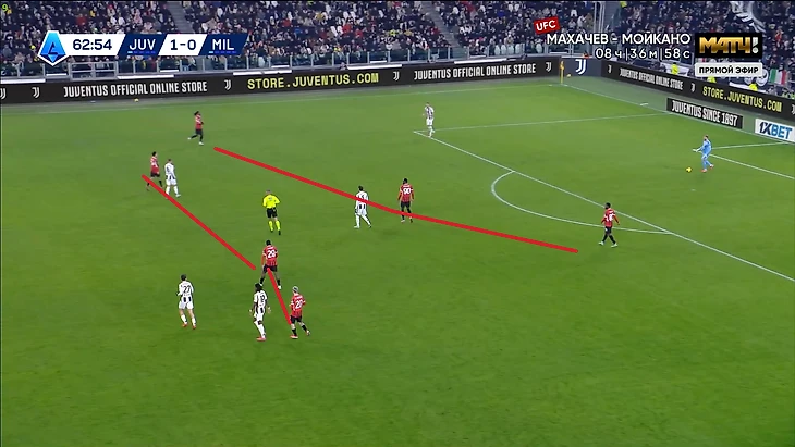 Но главное, конечно, то, что «Милану» удалось забрать инициативу на стартовом отрезке, и в первые 5 минут второго тайма владение первого было буквально отзеркалено: хозяева владели снарядом лишь 31% времени, и на самом деле, как мне кажется, такое рвение в начале тайма и сгубило «Милан» по итогу Дело в том, что прессинг все же не обладал 100% эффективностью, а значит его проходили, и проходили исправно, что, в свою очередь, приводит к кратному увеличению количества быстрых атак соперника, при которых «росснонери» зачастую просто не успевали грамотно расставиться (все-таки первая игра по новой схеме), и такие примеры были уже в первой половине (я их как раз приводил), вот только теперь их стало заметно больше Взять хотя бы первый гол «Ювентуса»: