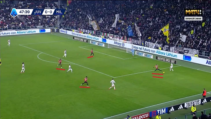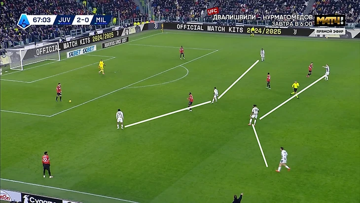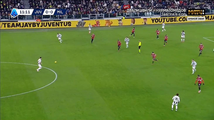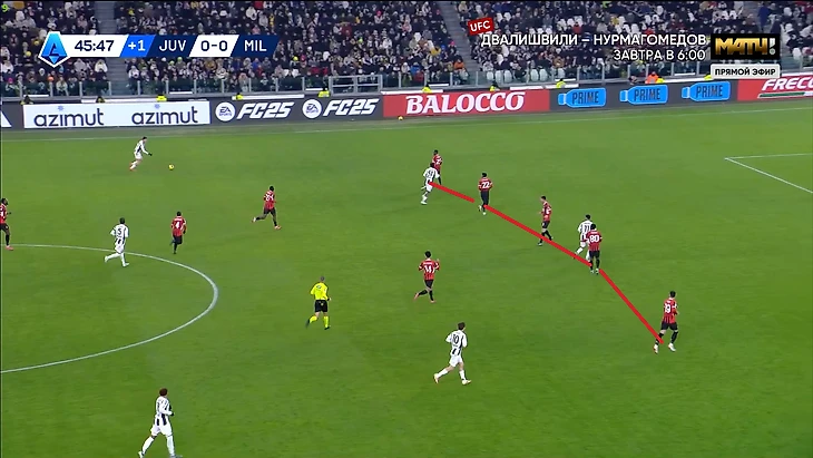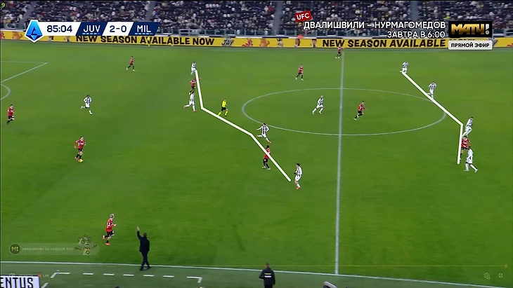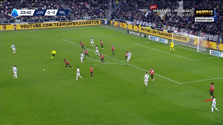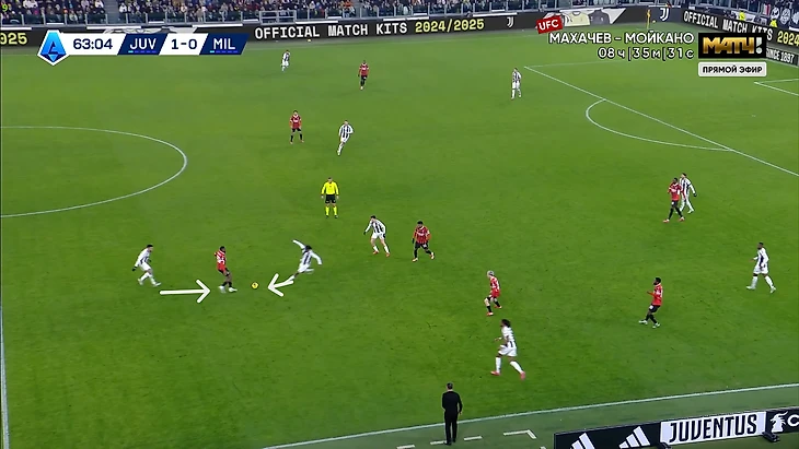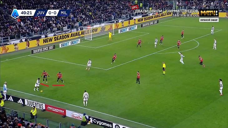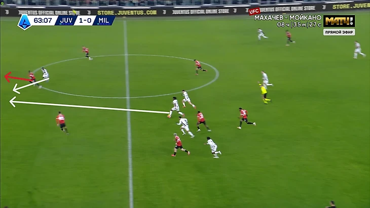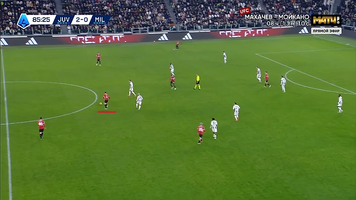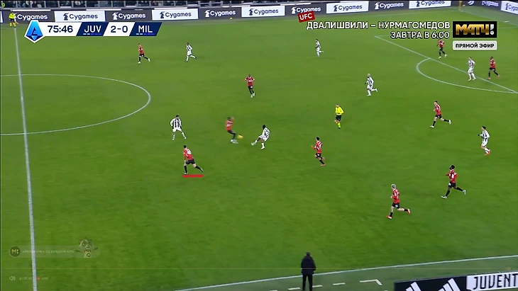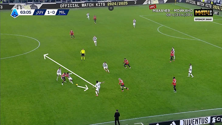 Однако тут, помимо очередной индивидуальной ошибки от игрока гостей (на этот раз от Томори, который вместо того, чтобы просто опередить Веа на мяче, побежал к своим воротам), нельзя не отметить и просто идеальную, по замыслу, контратаку «Юве». И началась она, кстати, с типичного для футбола Тьяго Мотты, отбора из полуокружения и с созданием численного преимущества около игрока соперника с мячом Затем, уже Тюрам идеально выбрал момент для передачи, которую, правда, все равно мог перехватить Томори, побеги он на мяч. Ну а Веа оставалось разобраться с Фикайо 1 в 1 и грамотно пробить, с чем Тимоти справился прекрасно. И в этом эпизоде как раз стало окончательно понятно, зачем вышел Веа - он куда быстрее своего турецкого конкурента по позиции, поэтому у Мотты появилась опция оставлять его самым высоким игроком при нахождении команды без мяча, а затем просто давать ему хороший пас на ход, что и произошло во втором голе. И вот тут мы подобрались, наверное, к самому важному моменту матча, когда стало, что камбек «Милана» и ничья на этот раз крайне маловероятны - моменту при 2-0, когда стало ясно - «Ювентус» не сел в оборону И вот это, наверное, главная тактическая победа Тьяго Мотты за последние несколько месяцев, ведь ему наконец удалось вдолбить игрокам, что в его футболе безвылазно садиться в средне-низкий блок при 1-0 и даже 2-0 - попросту губительно. «Ювентус» также агрессивно действовал в прессинге и отборе, продолжая закрывать в это полуокружение игроков «Милана» (особенно пострадал Хименес - у парня за полчаса на поле 8 потерь мяча):