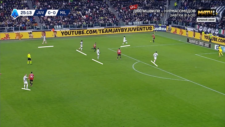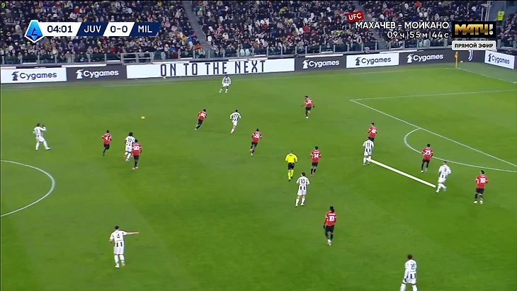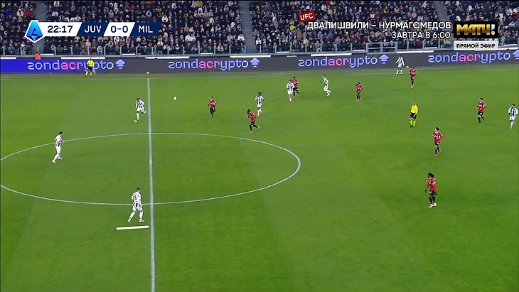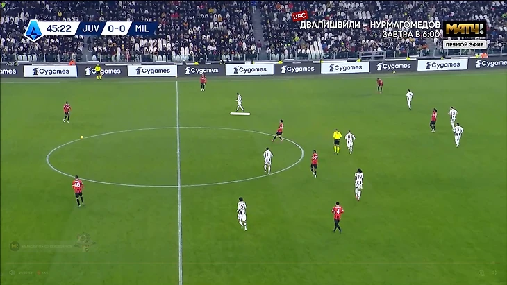 Да, именно так. По-другому эту 45-минутку описать крайне трудно, и на самом деле, не сказать, что произошло что-то парадоксальное. Ведь команды начали игру в достаточно спокойной и размеренном ритме: «Юве» просто взял мяч под контроль и лишь присматривался к сопернику без особого обострения, как и делает это обычно. Конечно, не настолько беспечно, как это делает та же «Боруссия» Шахина, но достаточно недалеко от подобного Тем более присматриваться было к чем: «Милан» впервые при Консейсау вышел в любимой формации португальского специалиста без мяча - 4-4-2:
